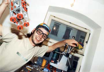 Mit Selbstauslöser, Bohrständer, Sicherheitsbrille und drei-Tage-Bart in der Küche. In der Hand: die später verworfene Ballmechanik.