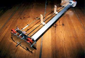 Nach den allerersten gescheiterten Versuchen mit rollengeführten Mechaniken war dies ein neuer Ansatz: Der Ball selbst sollte gleiten, und die Schiene auf der er gleitet (siehe Foto) sollte auf Rollen bewegt werden.