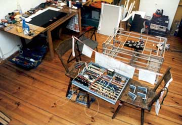 Im Vordergrund die Unterseite des Computers. Dahinter die Mechanik, und ganz dahinter meine Stereoanlage. Und auf der Stereoanlage mein ferngesteuerter Gabelstapler.