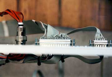 Diese drei Anschlüsse verbinden die Mechanik mit dem Relaiscomputer. Die roten Kabel links versorgen die Motoren mit Strom. Der mittlere RS-232-Anschluß überträgt den Strom aller Kontakte die das Spiel betreffen. Die rechte Steckverbindung überträgt ausschließlich Strom für die Punkteanzeige.